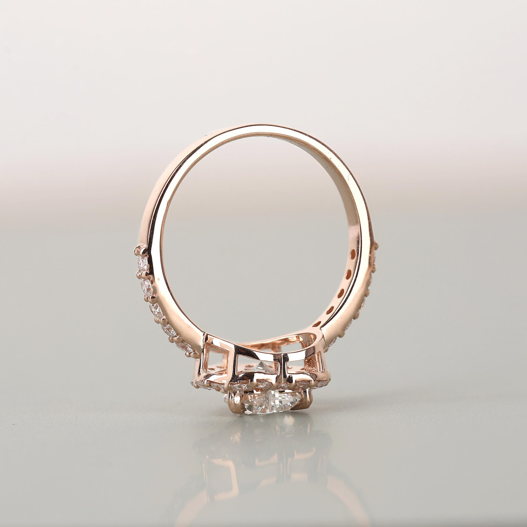 Crafted in premium rose gold, the band is accented with shimmering round diamonds, giving the ring a luxurious and romantic look. The delicate setting highlights the center stone while ensuring maximum sparkle from every angle.
