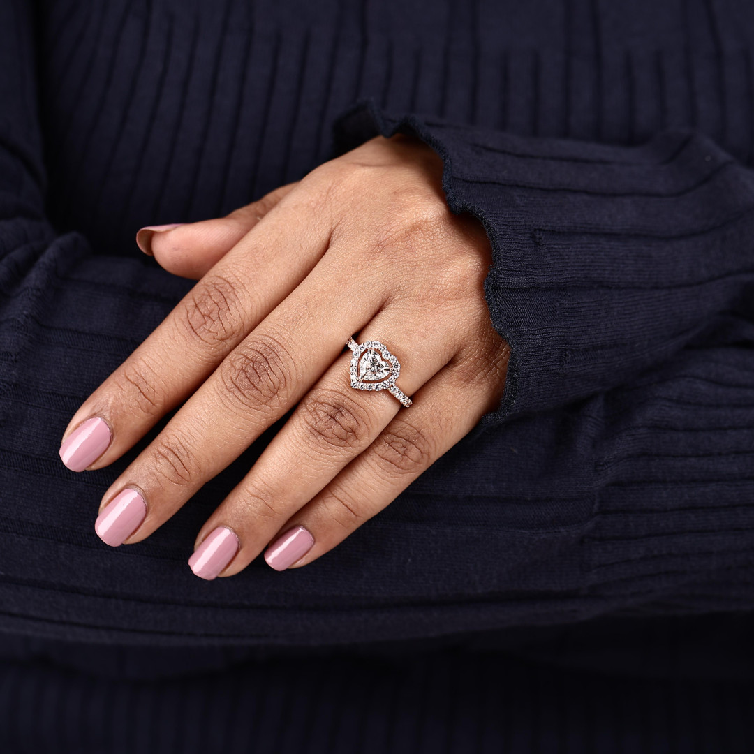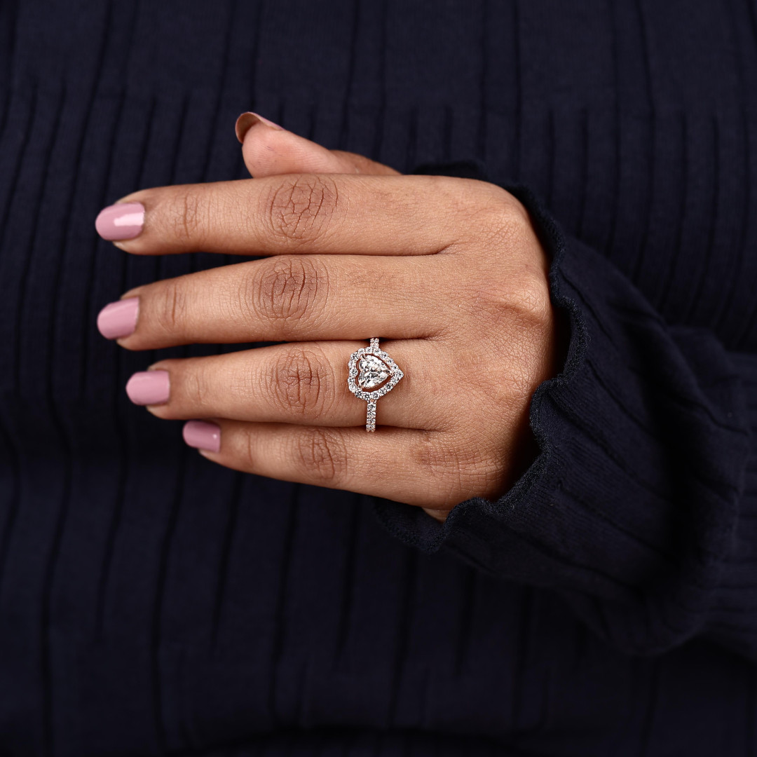 This stunning heart shape lab grown diamond ring is a true symbol of love and elegance. The center features a beautifully cut heart-shaped lab grown diamond, surrounded by a sparkling halo of round shape lab grown diamonds that enhance its brilliance.